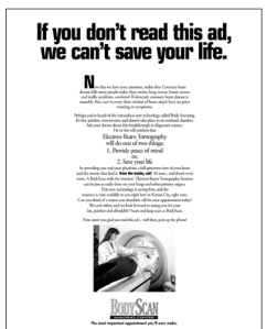 This kind of ad is part of a growing marketing strategy to cash in on your fears. They’re run by for-profit hospitals, medical centres, and sometimes just non-professional entrepreneurs who park their huge mobile body imaging vans in church, community or big box store parking lots.