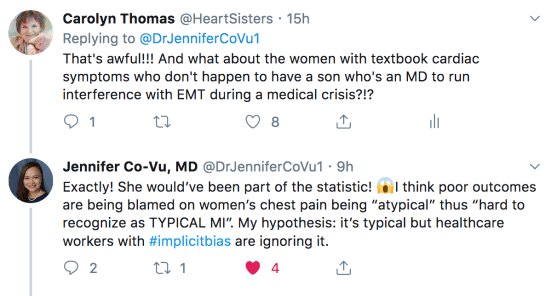 And as Dr. Co-Vu also determined in her Twitter exchange, the defense offered for women’s poor outcomes during a heart attack is often that women’s symptoms are “atypical”, thus easier to misdiagnose than in men.  She now maintains that even clearly “typical” cardiac symptoms like the crushing chest pain suffered by her mother-in-law can be ignored by healthcare professionals due to this pervasive implicit bias against women.