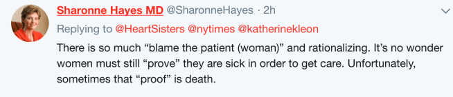 John Wesley (Baltimore, MD): “This is OLD NEWS.  2003 was more than just 15 years ago, it was a generation ago in terms of having access to troponin testing , sophisticated heart scans, ultrasound at the bedside, and widespread certification and training in emergency medicine.  Heart attacks in 40-year old postpartum women simply don’t commonly get ‘written off’ by sexist, uncaring doctors. I think it IS important to alert female patients that they can have heart disease at a young age, and we do need to fund more gender and age specific studies in medicine, but if you have symptoms like this woman had and you go to Emergency in 2019, you will get the care and diagnosis you need. It has nothing to do with medical school curriculum, physician ‘wokeness’ or mysogyny.”
