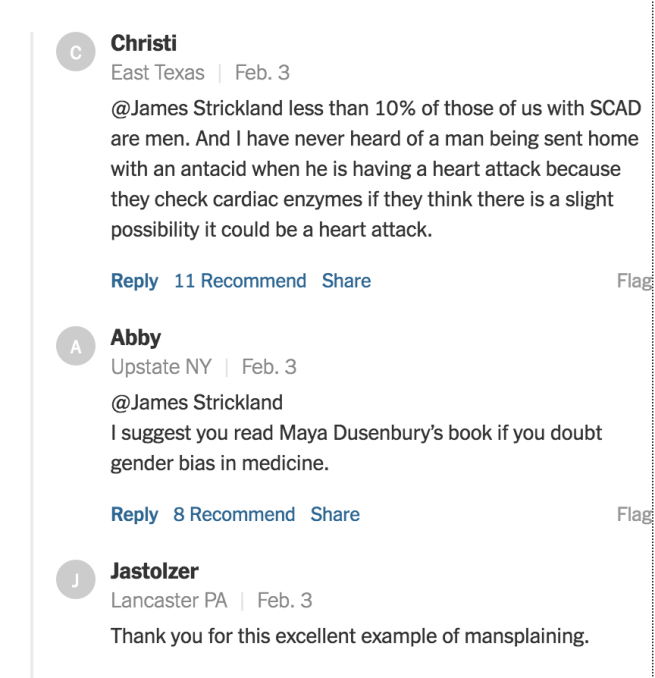 KSK (Maine):  “I am an Emergency physician. I am aware of bias in medicine against certain groups and I strive to avoid it in my own practice, but I feel articles like this confuse bias with diseases that are made difficult to diagnosis based on their rarity and/or unusual symptoms. Also worth noting is danger of over-testing, especially invasive testing. It’s a difficult problem for medicine, but I am not sure how much of a role gender bias plays.”