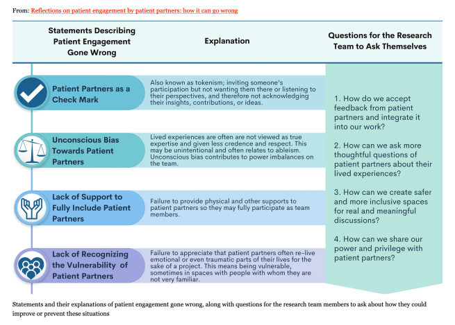 “Based on our experiences as patient partners in Canada, we presented a number of examples we have experienced where patient engagement has been ineffective, demoralizing and even harmful to patients.