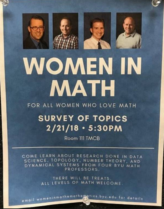 Speaking of math, I cannot possibly mention math and implicit bias in the same sentence without including this poster distributed at Utah’s Brigham Young University in 2018 – clearly the poster child of implicit bias in academia. I’m guessing that, based on the four head shots featured in this poster, none of the smiling white males would admit to either an implicit or explicit math-men stereotype (yes, even when you title your poster event “WOMEN IN MATH”!