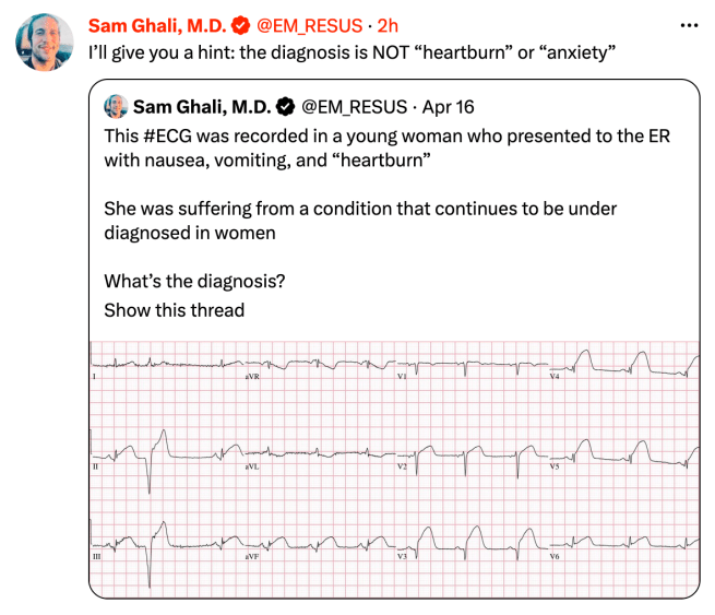 Last week, we learned here about a young Florida woman who arrived at her local Emergency Department with nausea, vomiting and “heartburn” – as described by Emergency physician Dr. Sam Ghali in the post called “I’ll Give You a Hint: the Diagnosis is NOT Heartburn or Anxiety”. He challenged his professional colleagues on Twitter, asking how they would have diagnosed this patient based on her distinctive ECG test results. Some of their guesses at interpreting the results missed her obvious heart attack, so Dr. Ghali reminded these healthcare professionals: