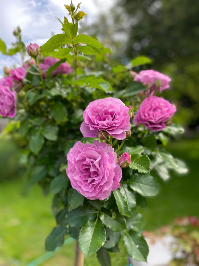 1. “Violet’s Pride” (a fairly recently developed rose named for the Downtown Abbey character, Lady Violet Crawley, played onscreen by the wonderful Maggie Smith). Ben chose a standard form of this unique rose (it’s basically a smallish tree rose, 3-4 feet of rosebush grafted onto a 3-foot trunk). Violet is a show-stopper: gorgeous fragrant blossoms peeking out from dark green glossy leaves.