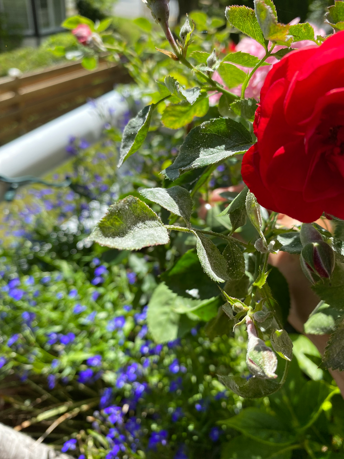 But wait – it gets worse for Scarlet: here’s a scary new pic of her lovely new blooms in August surrounded by the nasty rose fungus called powdery mildew on leaves and buds. ARRRRRGGGH!