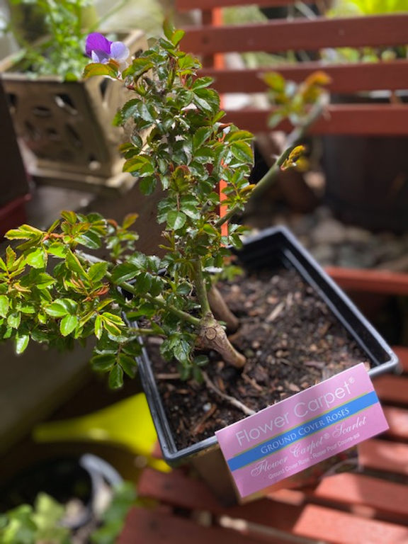 For maximum bloom, plants need consistently warmer temperatures at night – and that’s why my hanging basket rose will wait in its nursery pot in a sheltered corner of the balcony for a few more weeks. At this time of year, garden centre roses that started off as bare root plants during the winter (like my four Drift® roses in red, coral, apricot and pink) have now been transplanted into plastic pots by commercial growers, but we still need a few more weeks for those newly transplanted roses to grow stronger roots before moving them again.